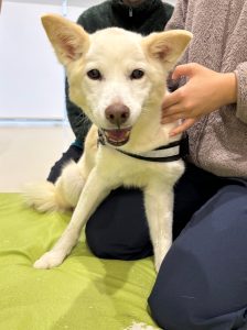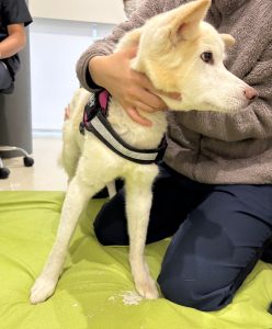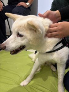 首の向きを左右に動かして、前肢が一緒についてこないかを確認します。一緒についてくるときは筋肉が固まってしまっているのでマッサージでほぐしていきます。
